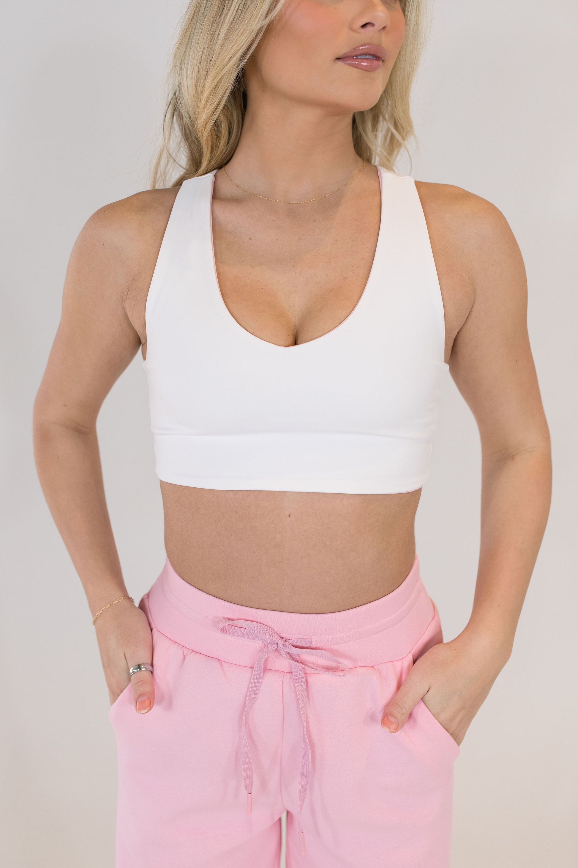 Longline v-neck bra top that reverses so it can be worn in two colors. This bra is made for low impact to medium impact workouts. No padding.