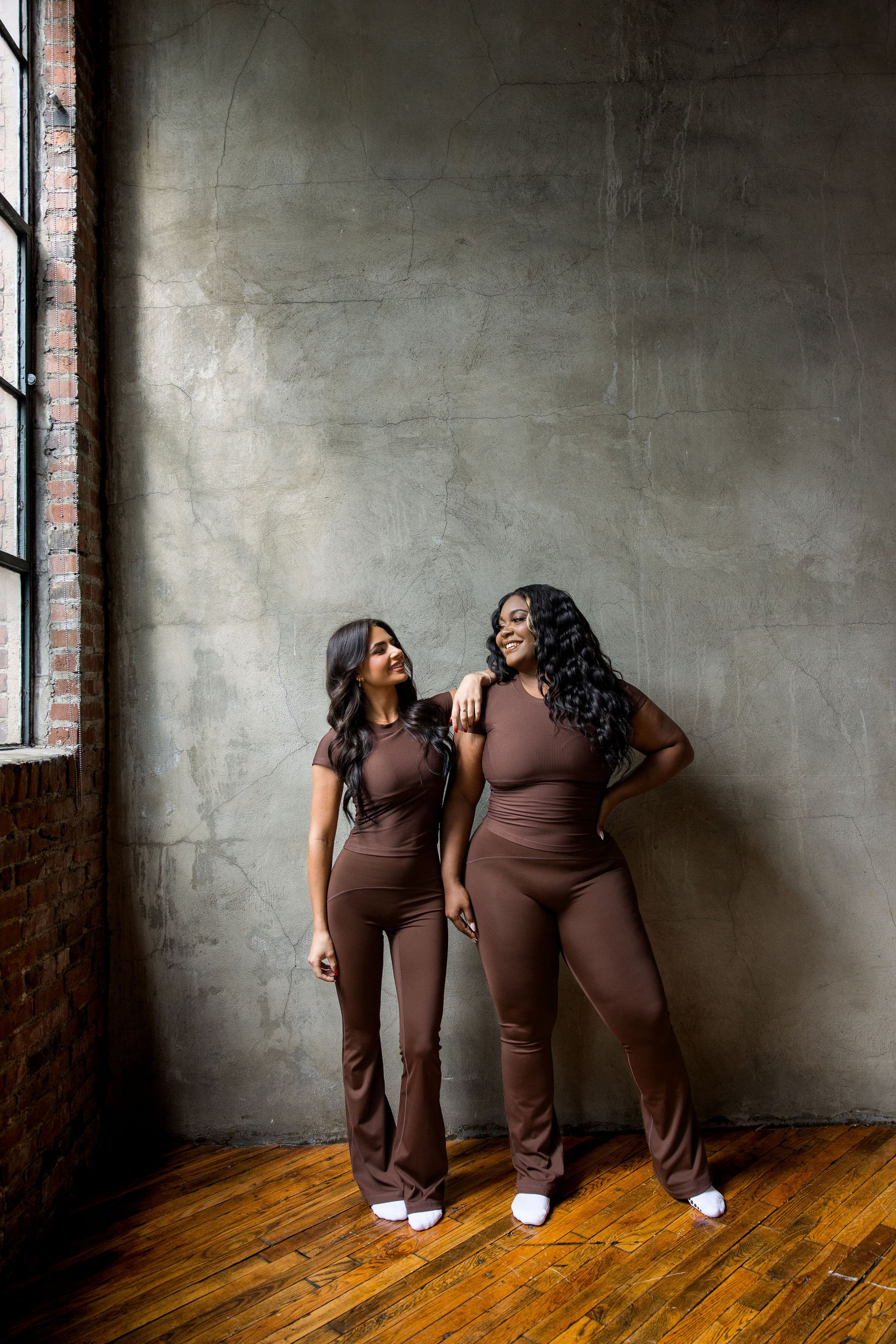High rise flare leggings that hug your body but are comfortable enough to be in all day long. We offer two inseams 31 in and 33 in.