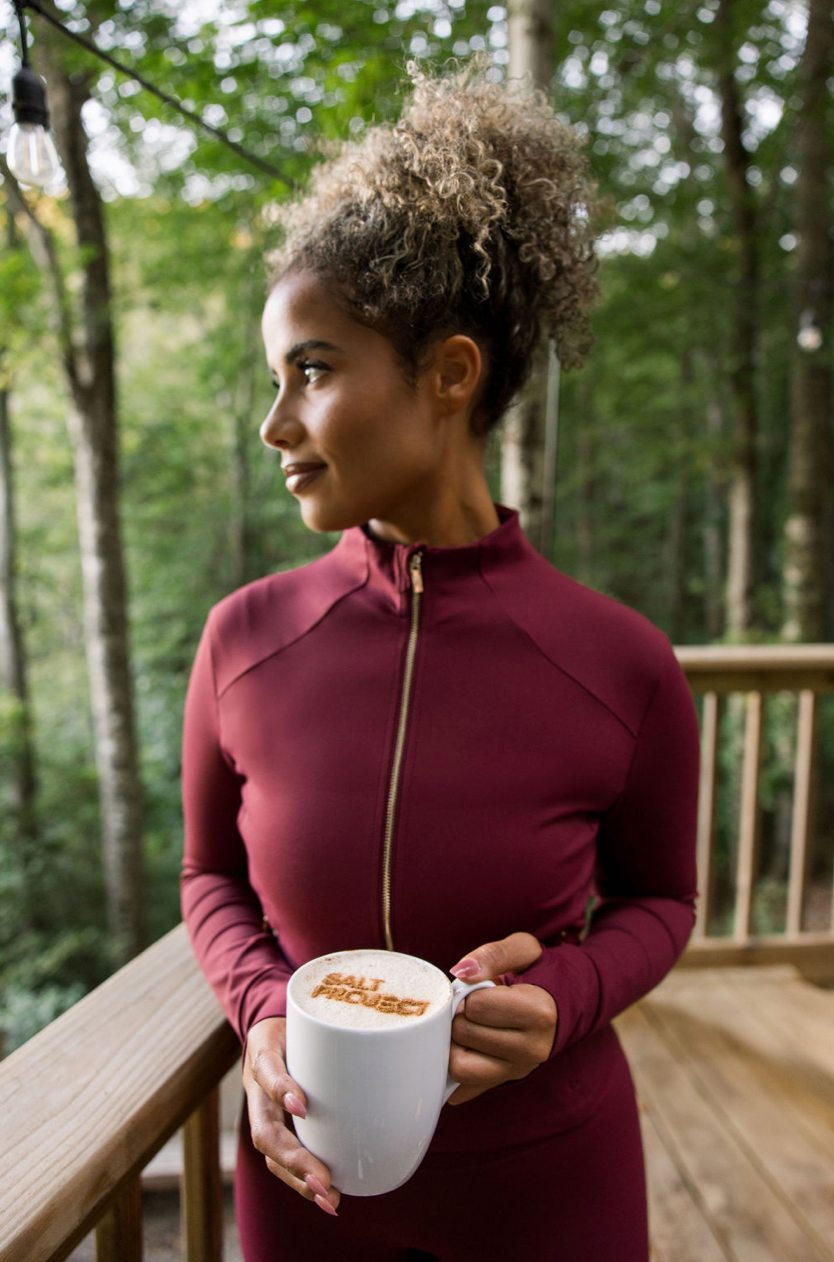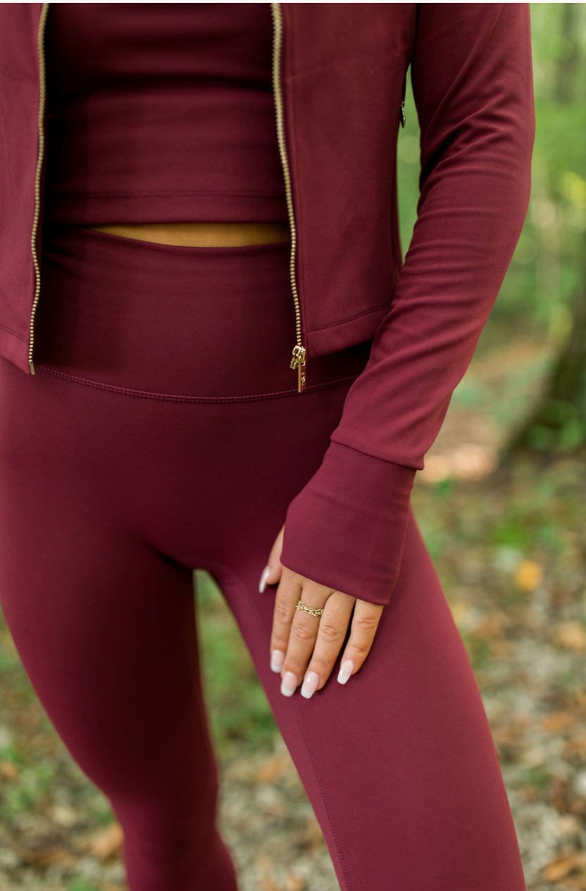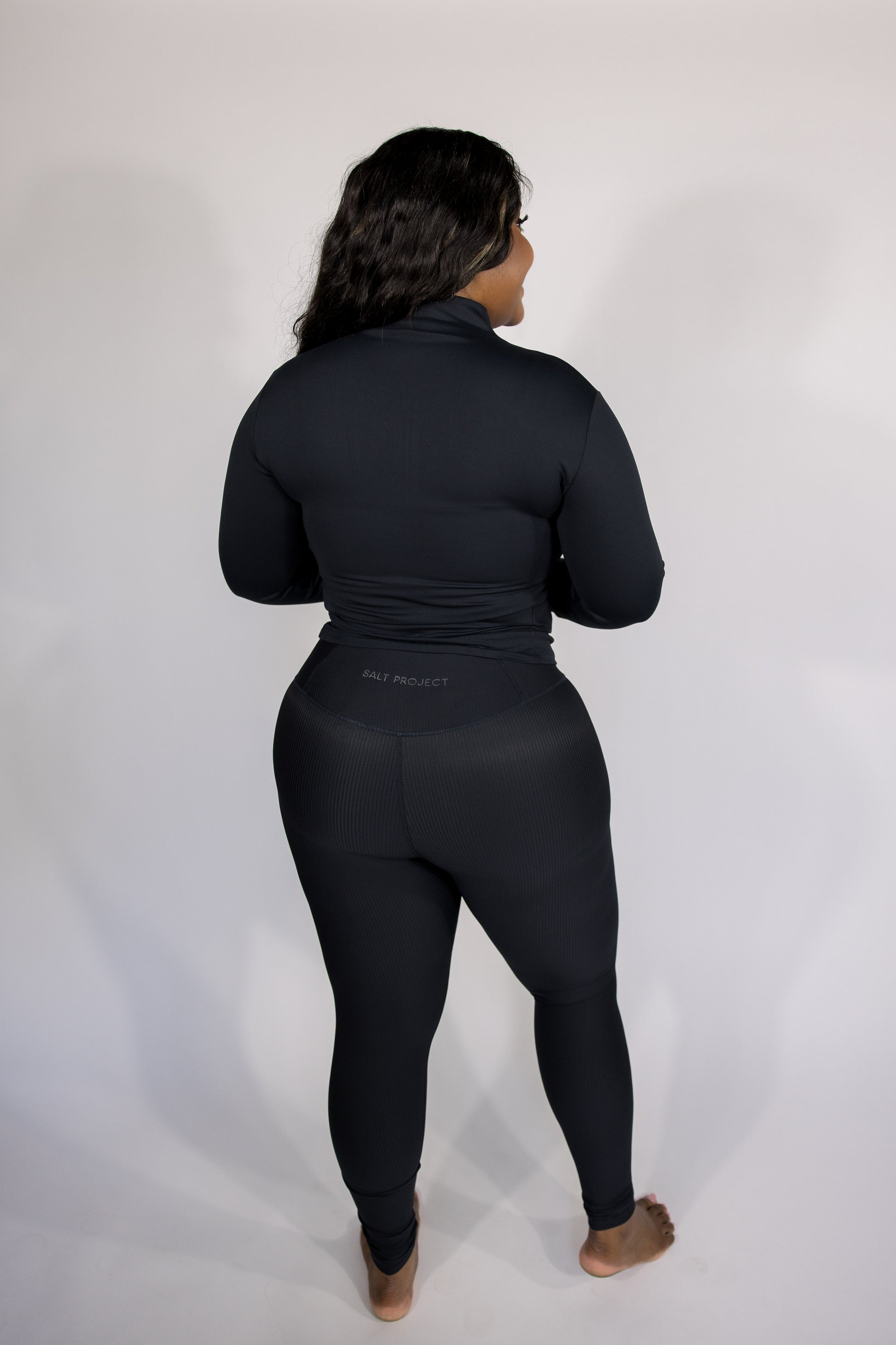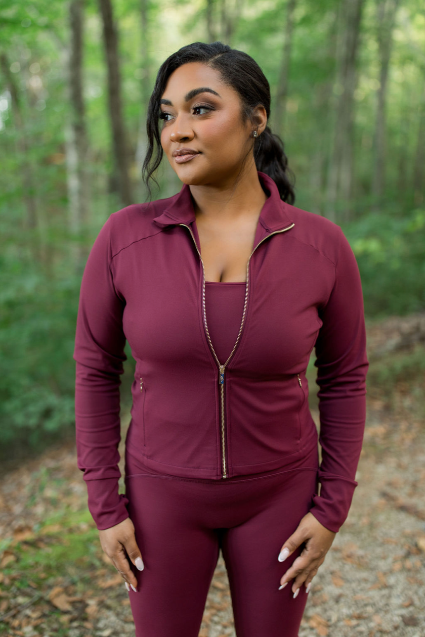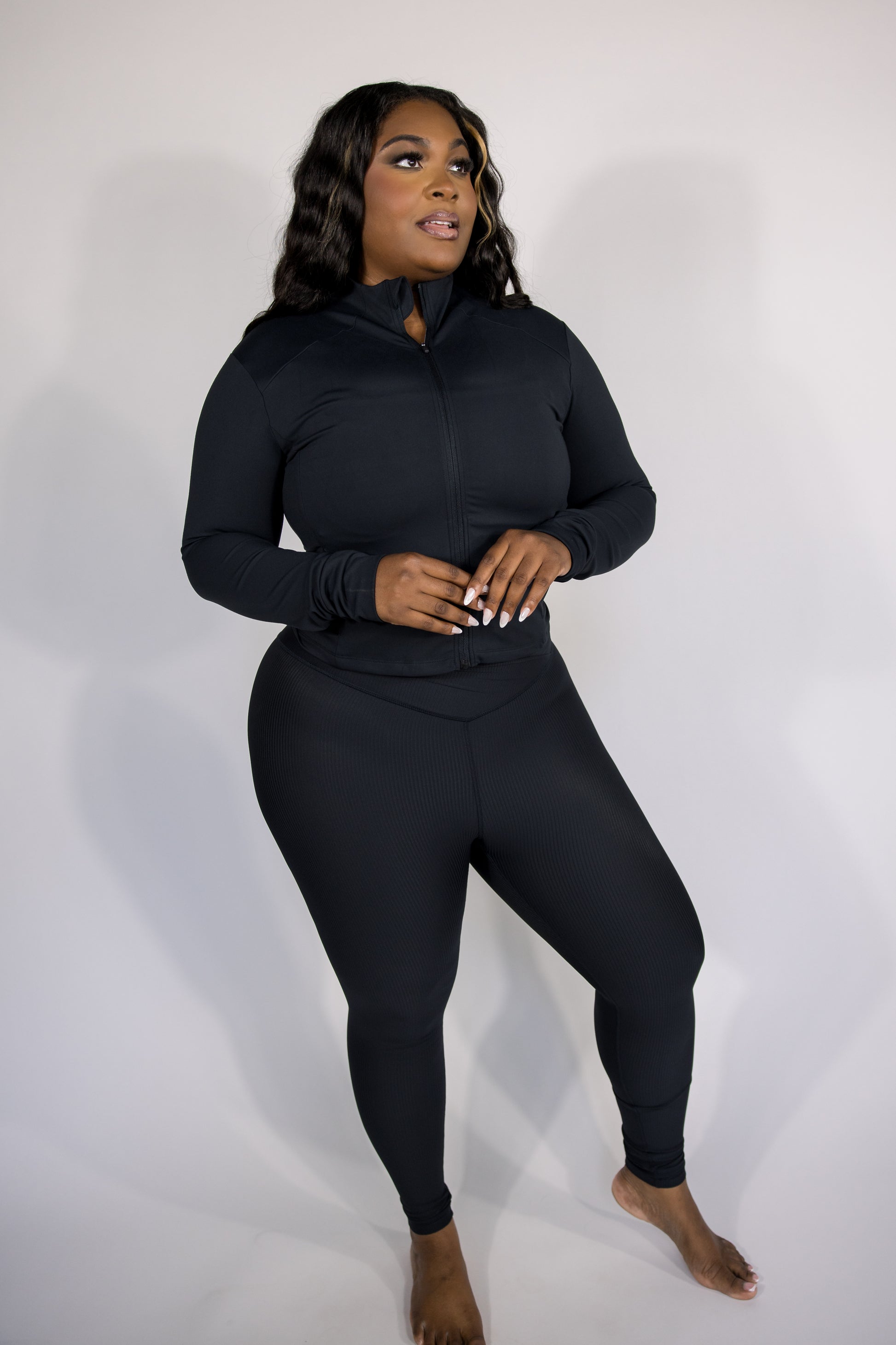 Form-fitting and flattering cropped full-zip jacket with zipper pockets and black and gold detailing.