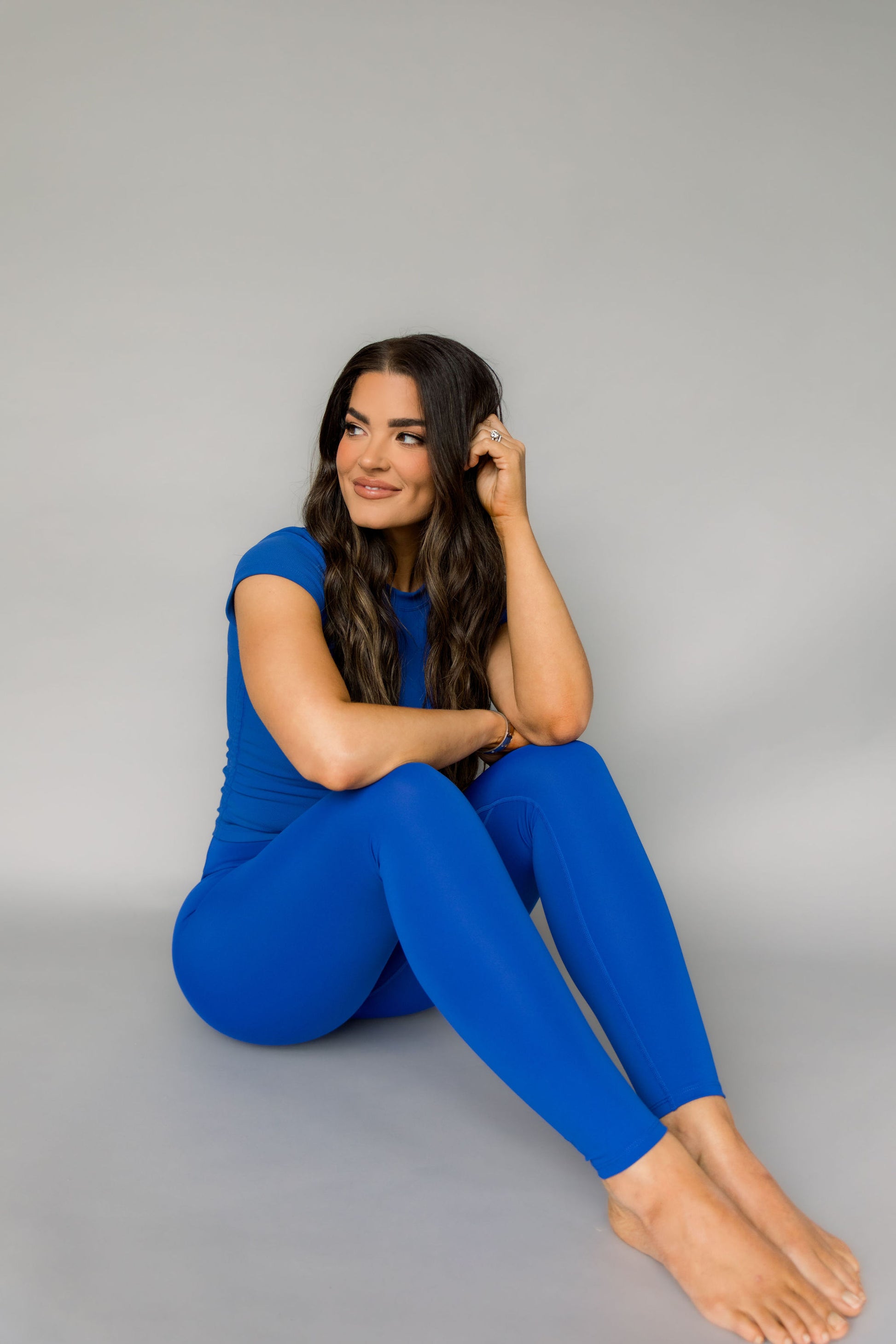 Our short sleeve baby tee is a cropped length with a cinched side for the most flattering fit. The length with leggings shows minimal midsection.