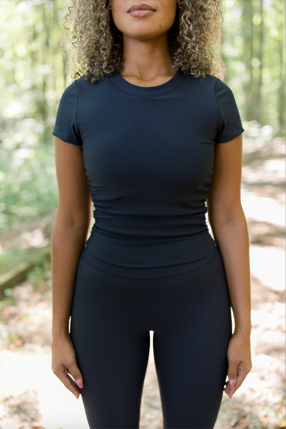 NEW STYLE WITH A BUILT IN BRA WITH SEWN IN PADDING. Our short sleeve baby tee is a cropped length with a cinched side for the most flattering fit. The length with leggings shows minimal midsection.