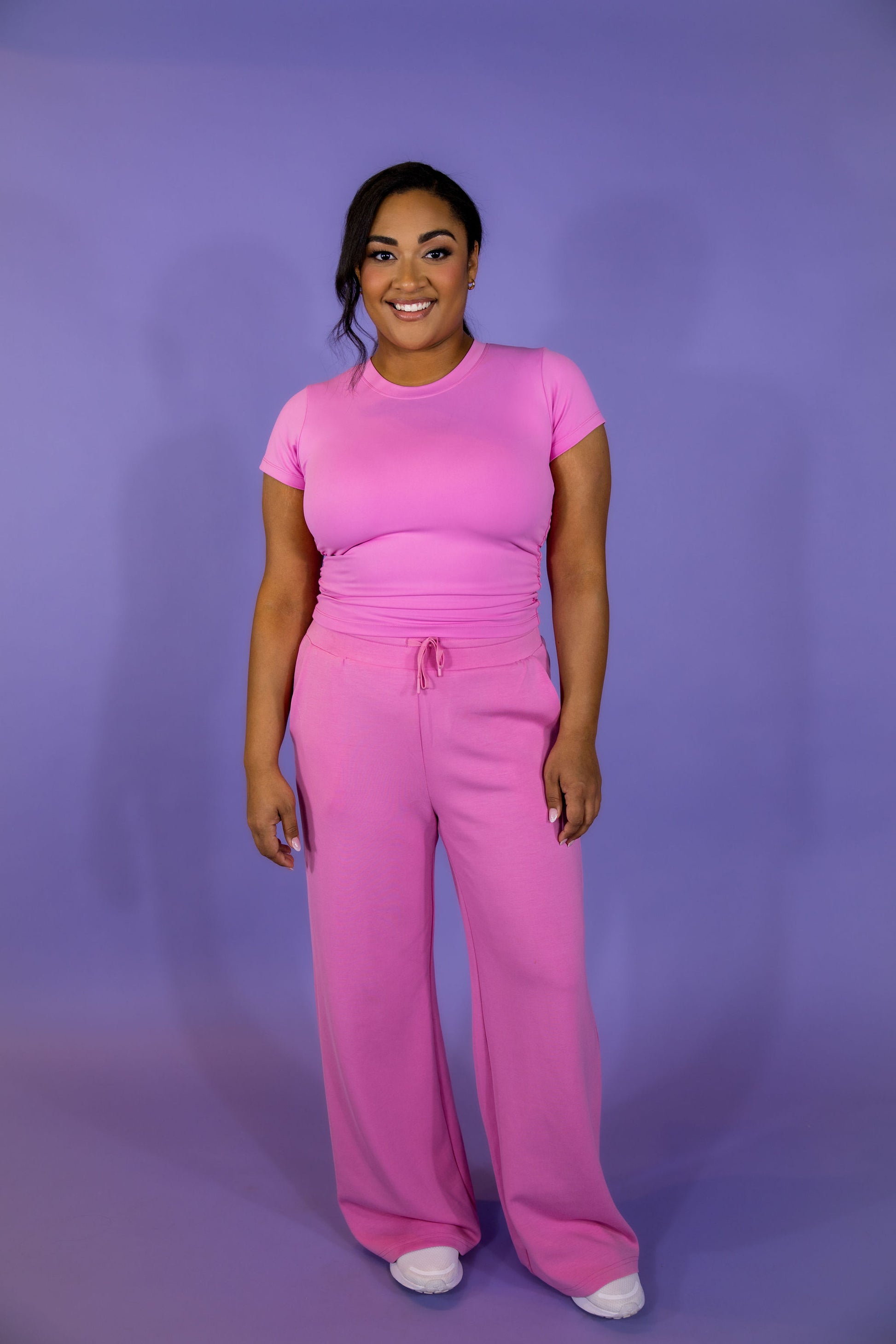 Our short sleeve baby tee is a cropped length with a cinched side for the most flattering fit. The length with leggings shows minimal midsection.