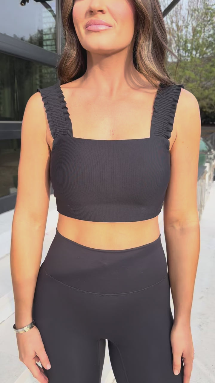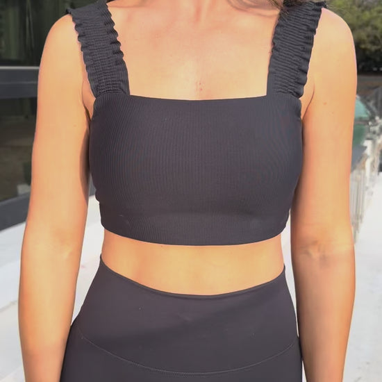 Made from a ribbed performance fabric. The ruffle straps and the twist-back detail do not sacrifice function. Inside, sewn-in pads stay perfectly in place—no shifting.