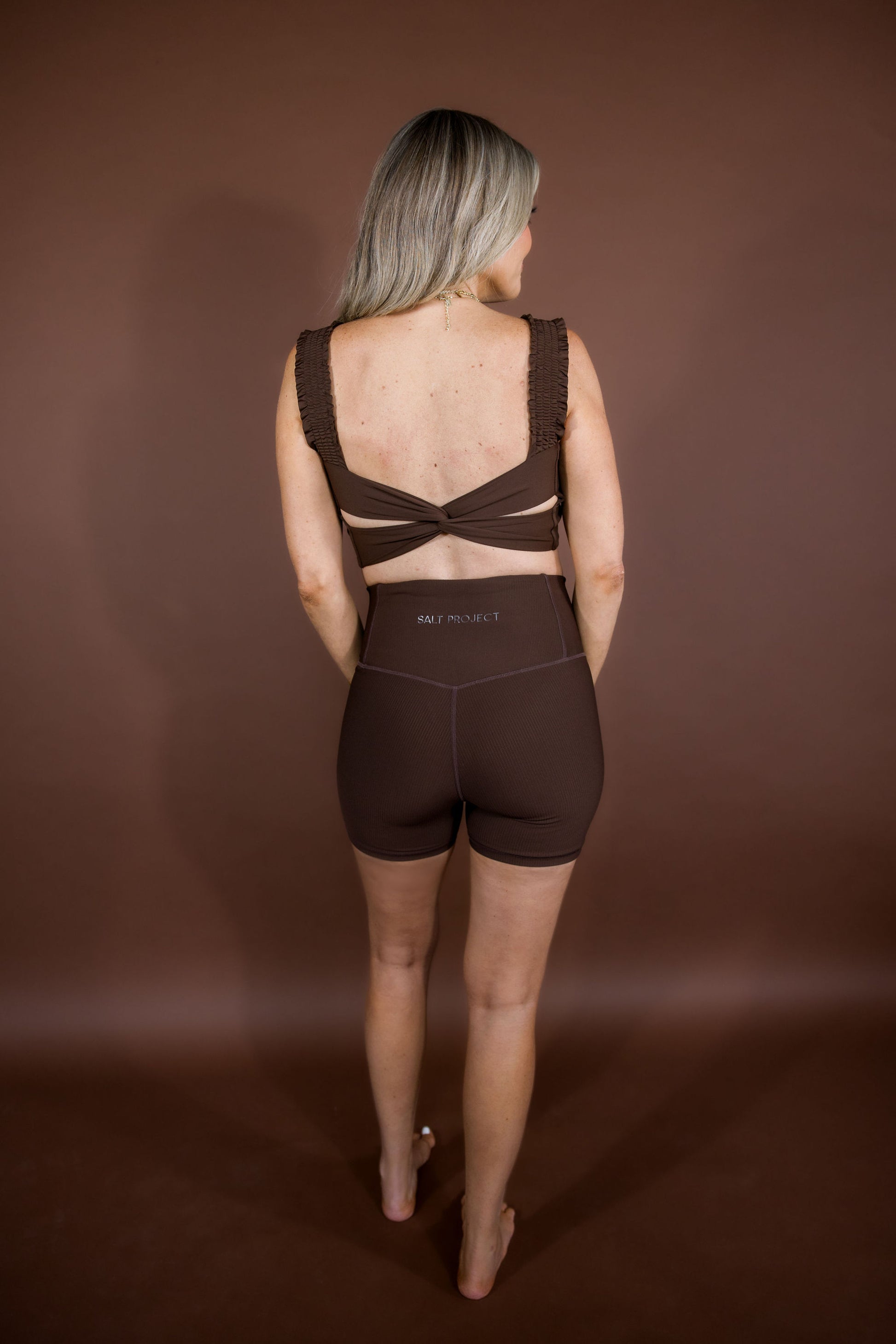 Back in a SMOOTH performance fabric. The ruffle straps and the twist-back detail do not sacrifice function. Inside, sewn-in pads stay perfectly in place—no shifting.